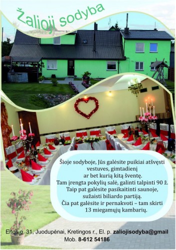 Šioje sodyboje, Jūs galėsite puikiai atšvęsti vestuves, gimtadienį ar bet kurią kitą šventę. Tam įrengta pokylių salė, galinti talpinti 70 žmonių. Taip pat galėsite pasikaitinti saunoje, sužaisti biliardo partiją. Čia pat galėsite ir pernakvoti – tam skirti 7 miegamieji kambariai. Viskas Jūsų patogumui. Pirmadienį-ketvirtadienį galima valandomis * Pokylių salė su židiniu (iki 70 žmonių) * Šokių salė * 13 kambarių (60 miegamų vietų) * Galime pasiūlyti vyrėjas ir muzikantus * 2 dušai, 5 tualetai, vonia * Suomiška pirtis (sauna) * Lauko baseinas * Kubilas (atskira kaina) * Virtuvė su visa reikalinga įranga maistui paruošti 70 žmonių (šaldytuvas, orkaitė, dujinė viryklė, indaplovė, mikrobangų krosnelė, kriauklė, el. virdulys, indai) * Garso aparatūra (muzikinis centras su DVD grotuvu) * Lauko pavėsinė su židiniu * 2 šašlykinės * Biliardas * SupynėsPaskutinį kartą redaguota: 2015-01-03, 13:10:24